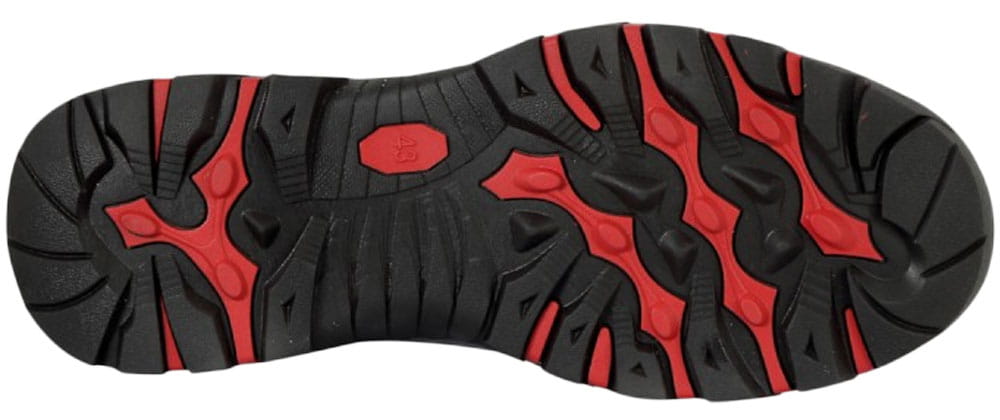 - Buty męskie wykonane zostały z trwałej i wytrzymałej na odkształcenia skóry nabukowej w kolorze czarnym z elementami w kolorze czerwonym oraz czarną podeszwą z protektorem.