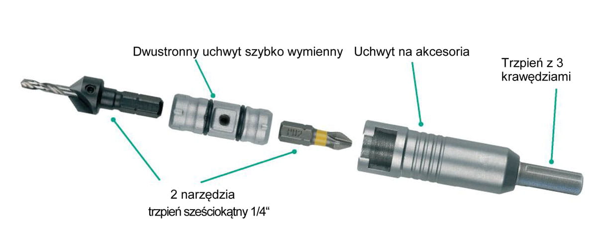 FLIPBIT Wolfcraft 2 uchwyty szybko zmienne do narzędzi. FLIPBIT to system montażu narzędzi w uniwersalnym uchwycie służący przyśpieszeniu i ułatwieniu dwuetapowych prac montażowych polegających na wierceniu, fazowaniu i skręcaniu.