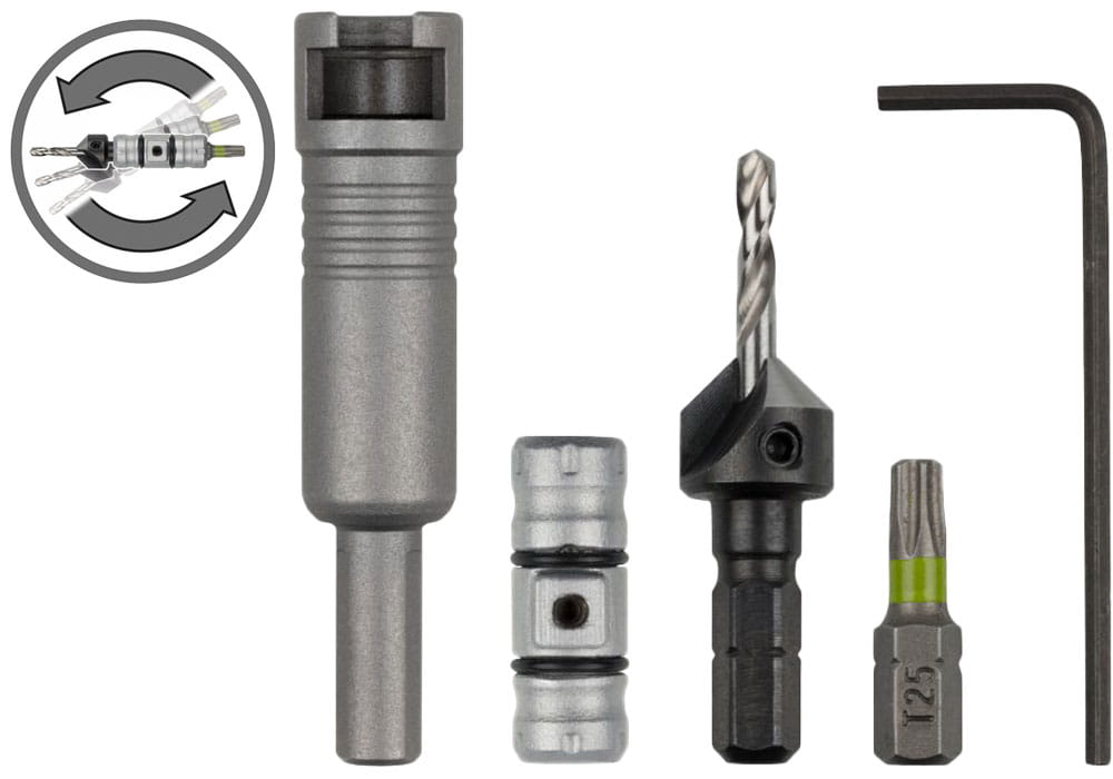 FFLIPBIT Wolfcraft startowy zestaw montażowy 4 cz. 3082000. FLIPBIT to system montażu narzędzi w uniwersalnym uchwycie służący przyśpieszeniu i ułatwieniu dwuetapowych prac montażowych polegających na wierceniu, fazowaniu i skręcaniu.
