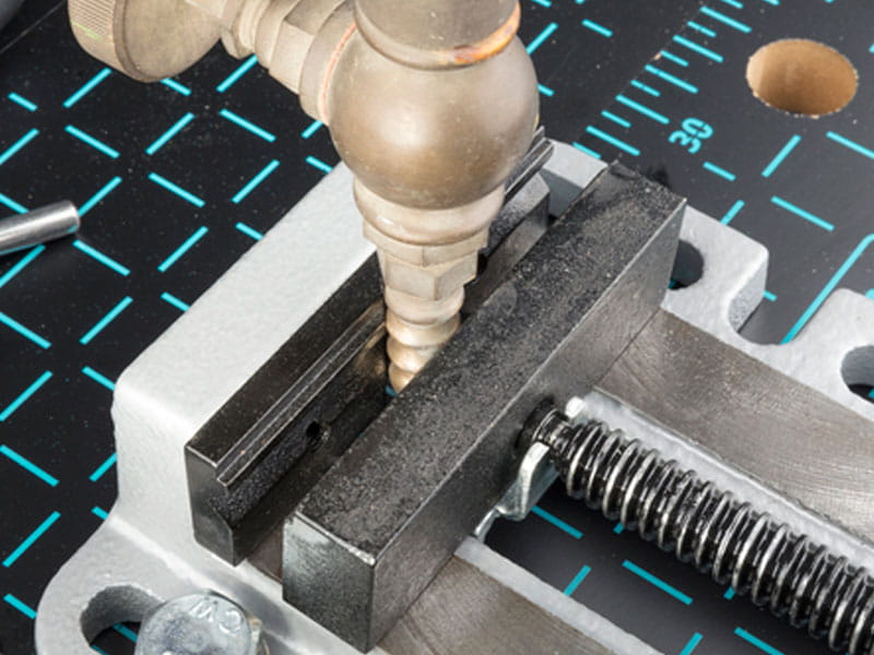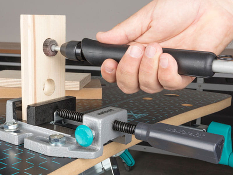 - stalowe szczęki z poziomym i pionowym rowkiem V do pewnego mocowania przedmiotów okrągłych,