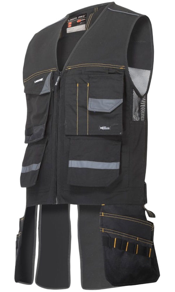 Kamizelka monterska Lahti Pro w kolorze czarnym. Model o wielu kieszeniach, łączący w sobie zalety kamizelki oraz pasa monterskiego.