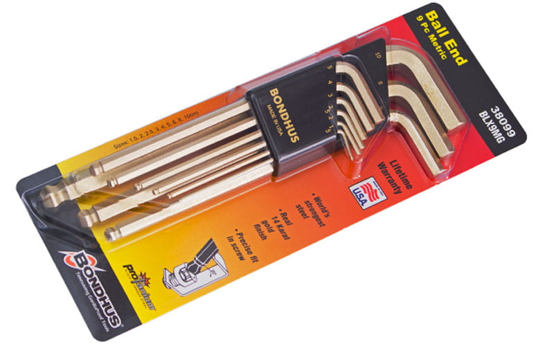 Najwyższej klasy, profesjonalny komplet kluczy imbusowych z kulką, wyprodukowany w USA przez firmę Bondhus – światowego lidera w produkcji kluczy imbusowych. Zestaw pochodzi z limitowanej serii dodatkowo pokrytej 14 karatowym złotem dla jeszcze lepszej ochrony oraz podkreślenia prestiżu i jakości.
