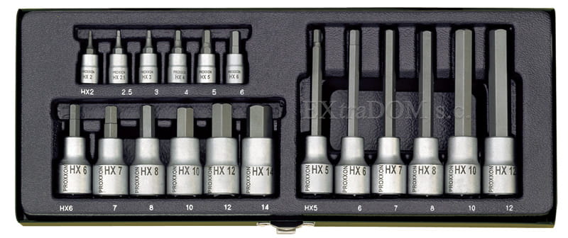 Profesjonalny zestaw kluczy imbusowych firmy PROXXON komplet 18szt. 2 – 14mm w standardzie 1/4" i 1/2". Zestaw narzędzi adresowany do bardzo wymagających, profesjonalnych użytkowników. Ze względu na dobór elementów zestawu szczególnie polecany dla mechaników samochodowych.