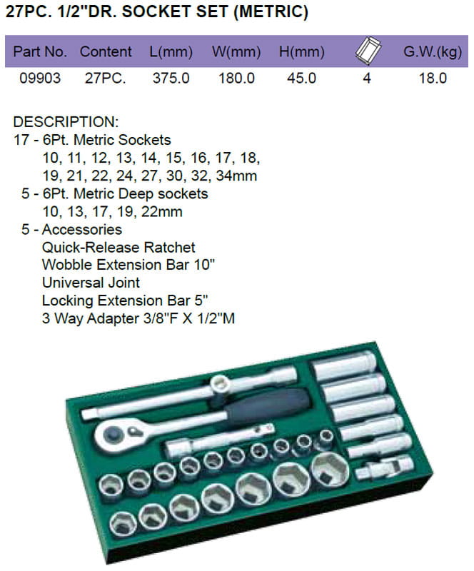 Klucze nasadowe 1/2" SATA zestaw 27 części - wkładka do wózka narzędziowego. Zestaw najczęściej używanych kluczy nasadowych w standardzie napędu 1/2”. Polecany do profesjonalnego użytku w serwisie mechanicznym.