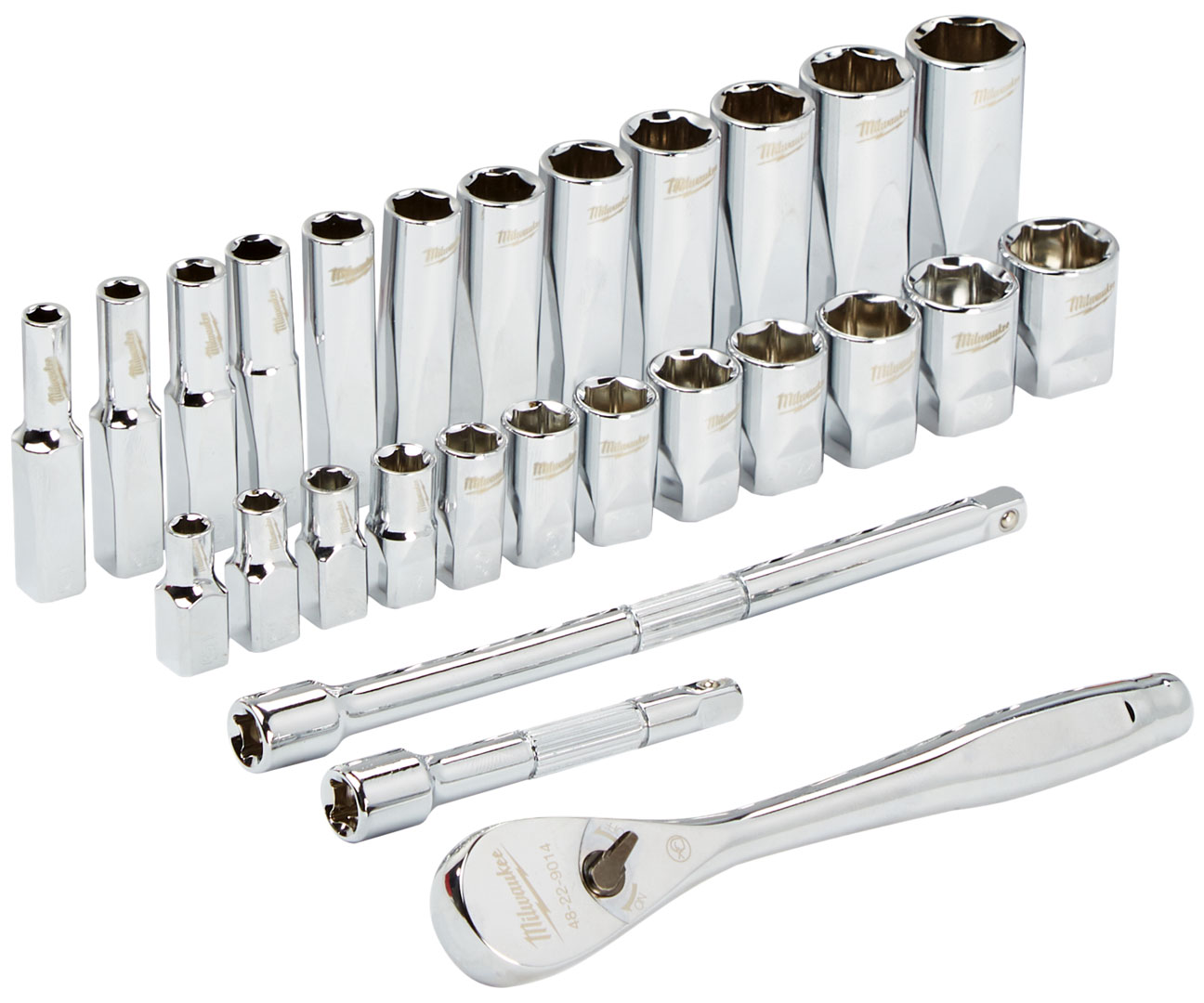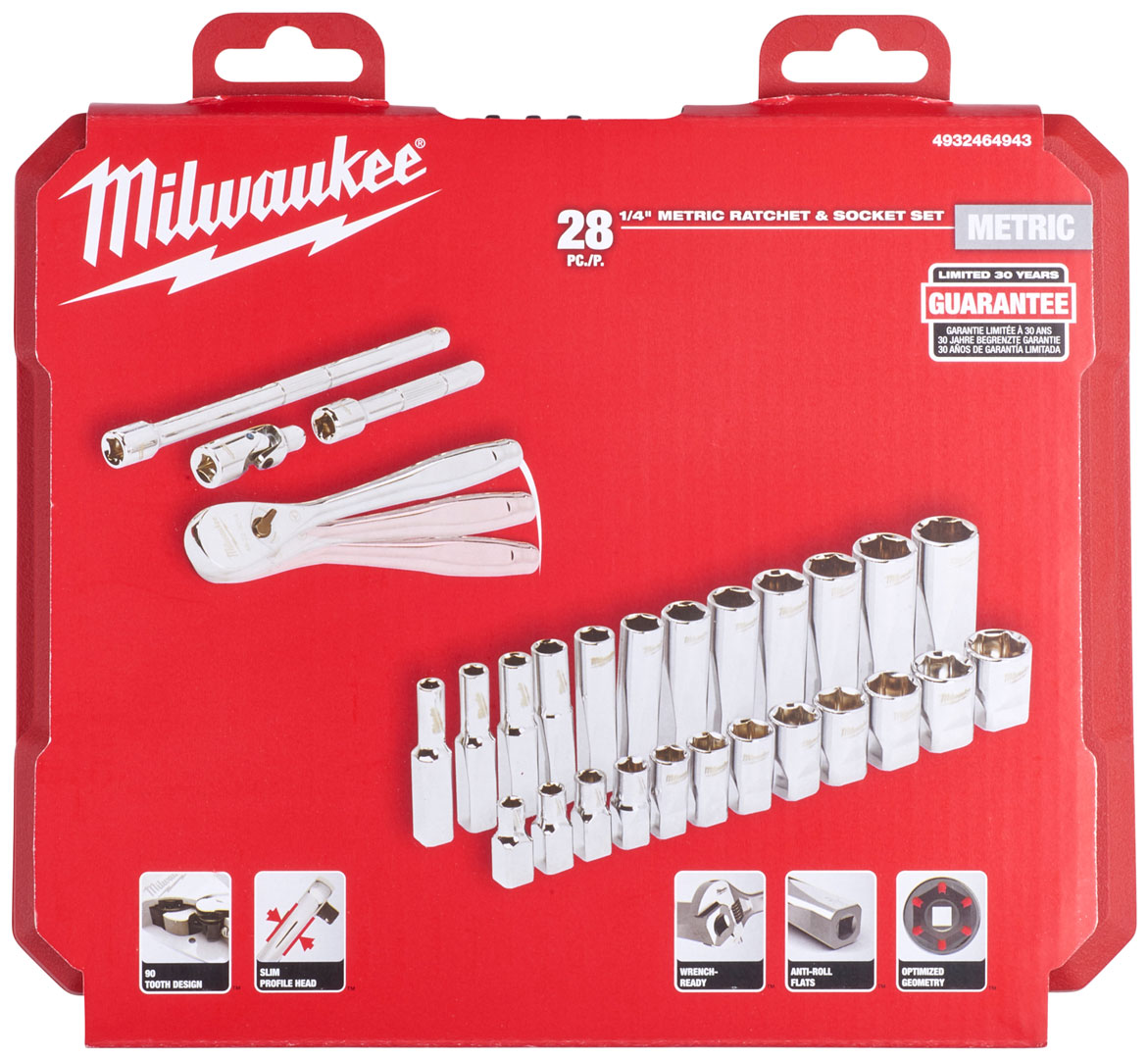 Klucze nasadowe Milwaukee 1/4˝ z grzechotką, metryczne, kpl. 28 szt. w skrzynce 4932464943