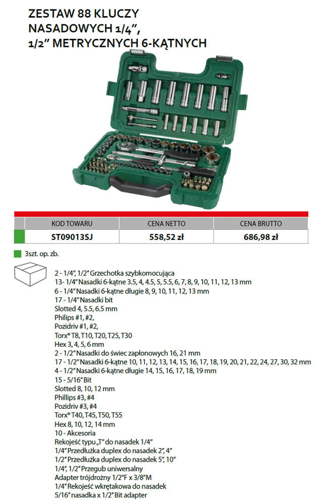 - HEX 6-KĄTNE: 8 - 10 - 12 - 14mm; - Profesjonalne grzechotki szybkomocujące: 1/4" oraz 1/2";
