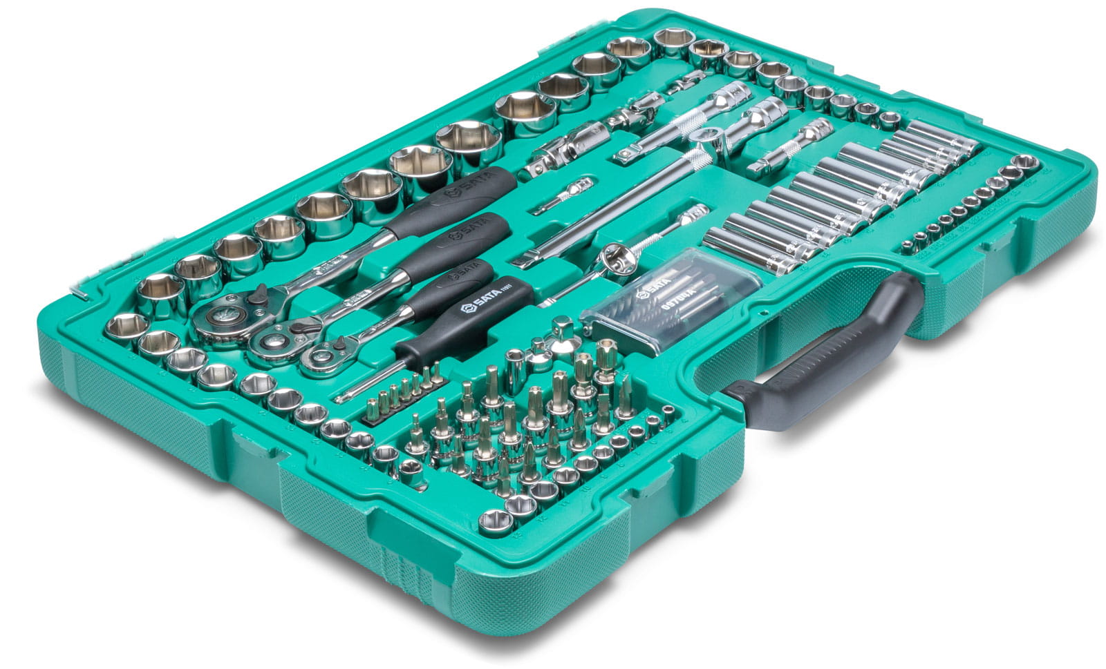 Klucze nasadowe metryczne i calowe, klucze płasko - oczkowe i trzpieniowe oraz bity 1/4" 3/8" 1/2” Sata zestaw 120 sztuk. Rozbudowany zestaw narzędziowy polecany do profesjonalnego użytku w serwisie motoryzacyjnym.