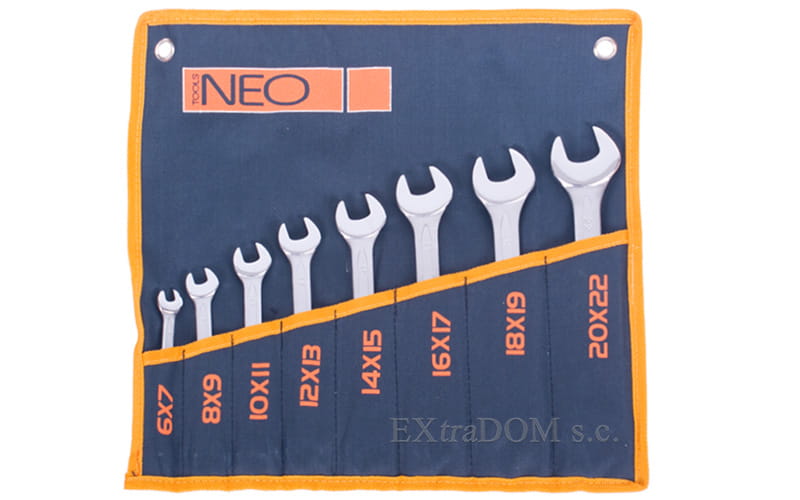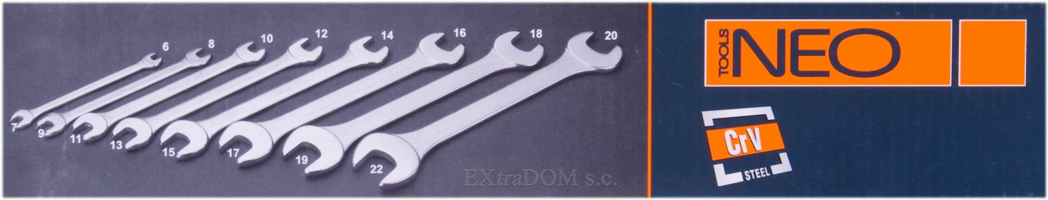 Zestaw kluczy płaskich dwustronnych kpl. 8 części marki Neo Tools. Wysokiej jakości klucze płaskie chromowo-wanadowe, szczególnie przeznaczone do pracy w warsztatach profesjonalnych i hobbystycznych pod zmiennymi obciążeniami.