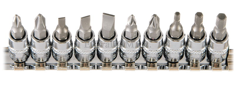 - Nasadki umieszczone są na stalowej szynie z szybko-złączami, którą można przykręcić do ściany lub tablicy narzędziowej. Szyna zapewni też porządek w szafce lub skrzyni narzędziowej.