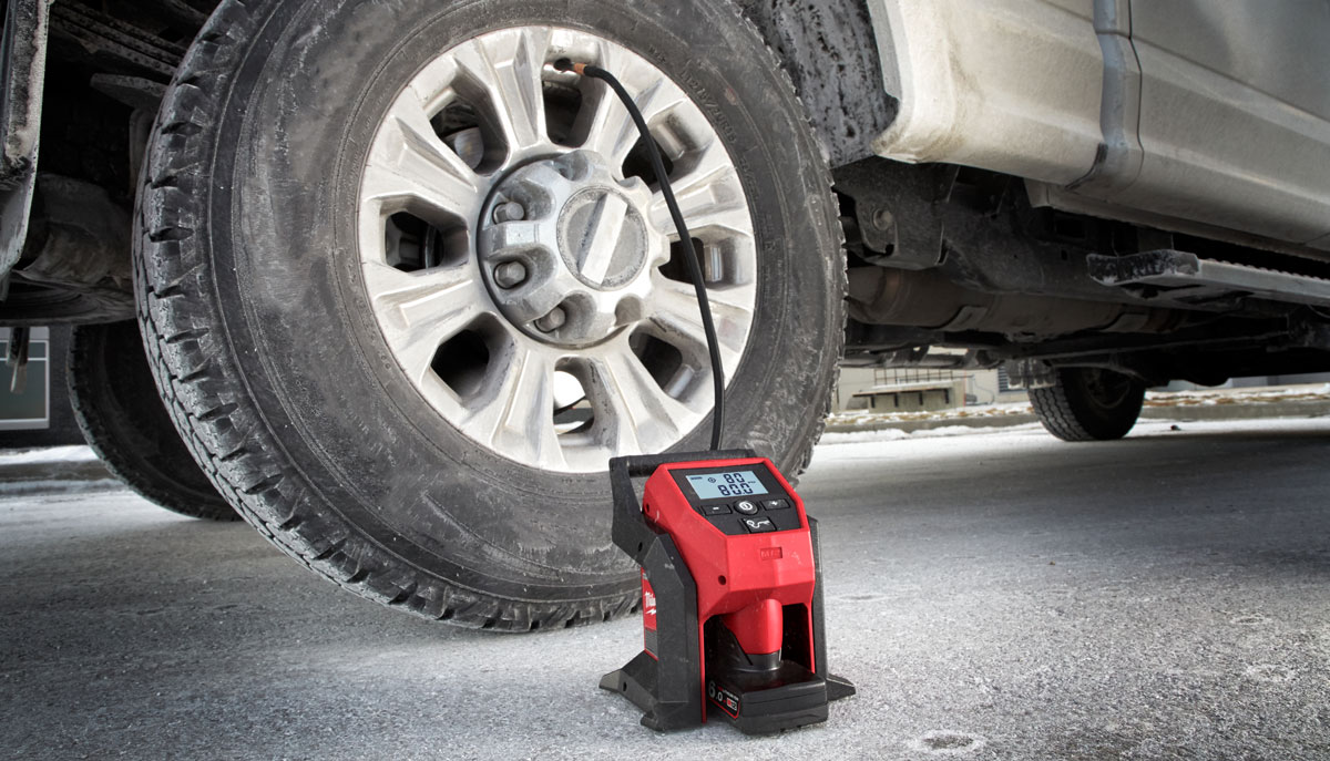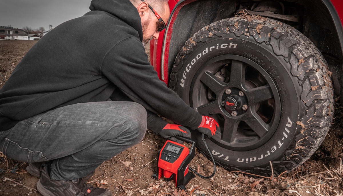 Kompresor akumulatorowy Milwaukee M12BI – kompaktowa i lekka konstrukcja umożliwia łatwe pompowanie opon w samochodach osobowych oraz lekkich samochodach dostawczych.