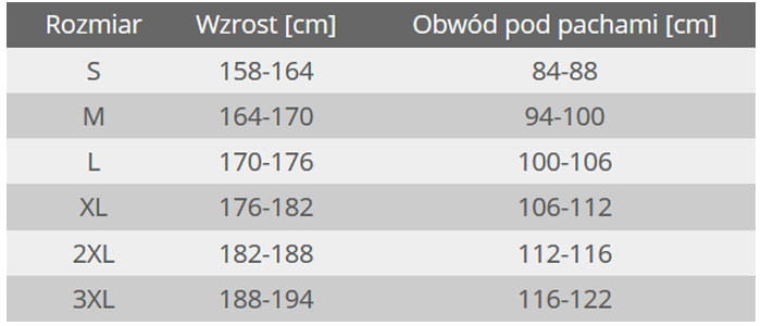 - obwód klatki piersiowej (mierzony pod pachami): 94 - 100 cm.