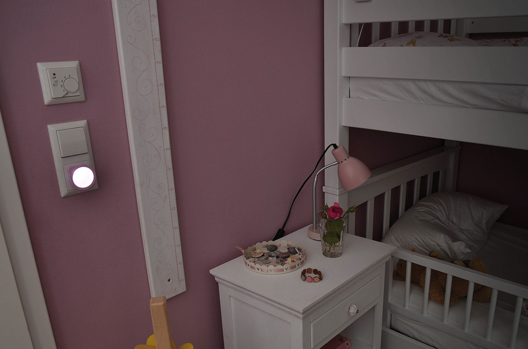 - Lampka nocna nadaje się np. do sypialni, pokoju dziecięcego, do salonu, korytarza lub toalety.