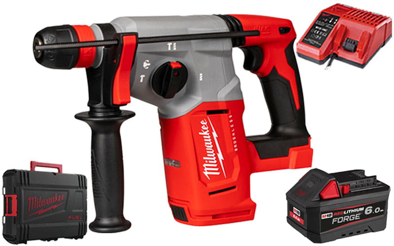 Młotowiertarka akumulatorowa SDS-Plus Milwaukee 18V 2,3J M18BLHX-601X w zestawie z jednym akumulatorem M18™ 6.0 Ah FORGE™ oraz szybką ładowarką, całość w walizce HD Box.