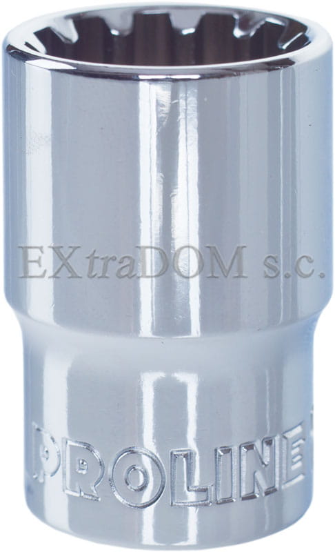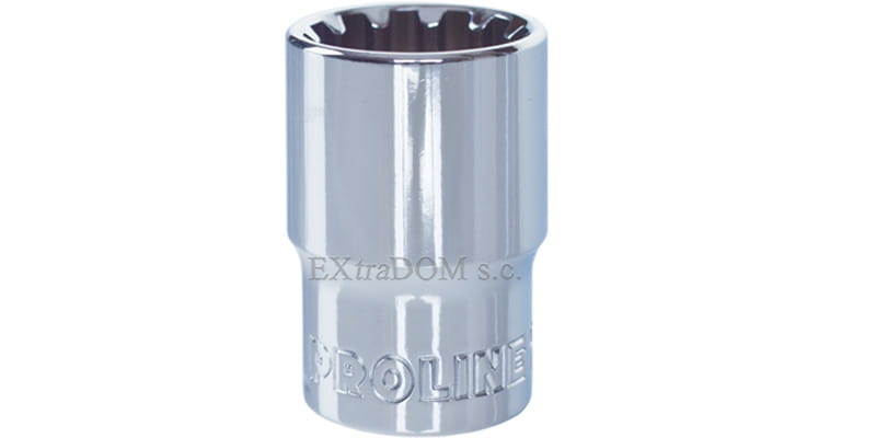 Profesjonalna nasadka uniwersalna spline marki Proline. Nasadki spline posiadają uniwersalny kształt umożliwiający pracę z nakrętkami i śrubami szęściokątnymi, metrycznymi i calowymi, kwadratowymi, Torx i Spline. właściwości wytrzymałościowe nasadek są wyższe od wymagań DIN 3124 i PN-ISO 1711. Nasadki Proline są kute ze stali chromowo - wanadowej, poddane precyzyjnemu procesowi hartowania i odpuszczania gwarantującemu właściwą twardość i wytrzymałość. Są one chromowane i polerowane w celu zabezpieczenia antykorozyjnego nasadki.