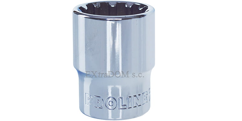 Profesjonalna nasadka uniwersalna spline marki Proline. Nasadki spline posiadają uniwersalny kształt umożliwiający pracę z nakrętkami i śrubami szęściokątnymi, metrycznymi i calowymi, kwadratowymi, Torx i Spline. właściwości wytrzymałościowe nasadek są wyższe od wymagań DIN 3124 i PN-ISO 1711. Nasadki Proline są kute ze stali chromowo - wanadowej, poddane precyzyjnemu procesowi hartowania i odpuszczania gwarantującemu właściwą twardość i wytrzymałość. Są one chromowane i polerowane w celu zabezpieczenia antykorozyjnego nasadki.