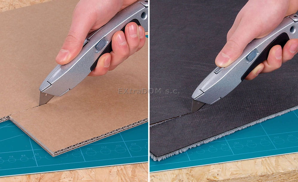 Nóż z ostrzem trapezowym przeznaczony do pracy z takimi materiałami jak: wykładziny dywanowe, PCV, miękkie tworzywa sztuczne, cienkie drewno, folie, tapety, kartony, pianki, i wiele innych.