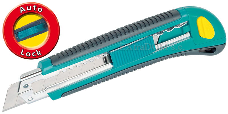 Nóż z ostrzem łamanym przeznaczony do pracy z takimi materiałami jak: wykładziny dywanowe, PCV, miękkie tworzywa sztuczne, cienkie drewno, folie, tapety, kartony, pianki, i wiele innych.