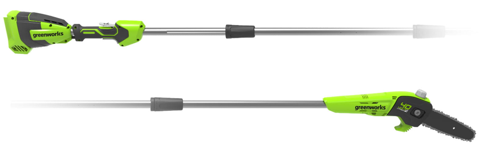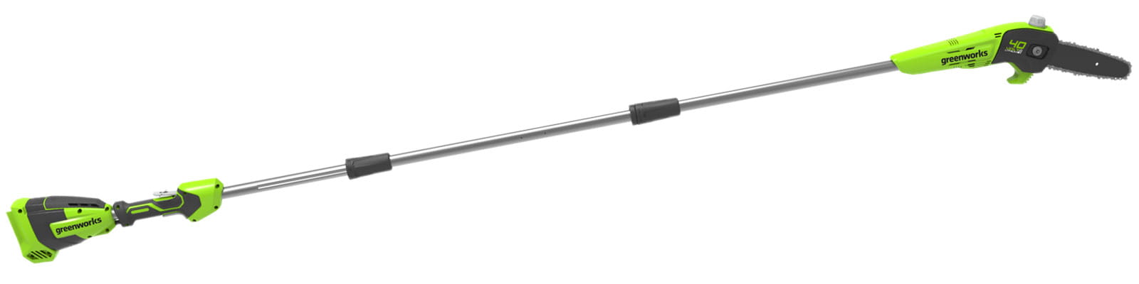 - Lekka (3,6 kg) pilarka łańcuchowa na wysięgniku do wygodnego cięcia gałęzi z podłoża.