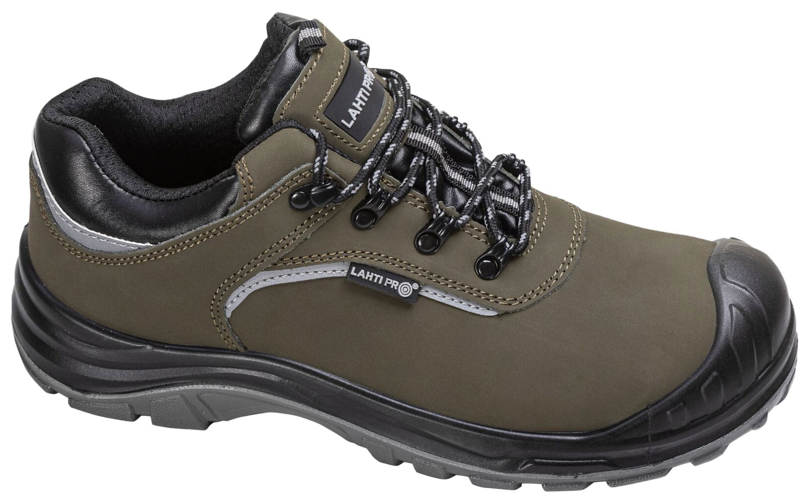Wyprodukowane przez renomowanego producenta, Lahti Pro, z myślą o osobach pracujących w wymagających środowiskach przemysłowych, budowlanych i magazynowych. Półbuty wykonane są z naturalnej skóry nubukowej, zapewniającej długotrwałe użytkowanie i odporność na ścieranie.