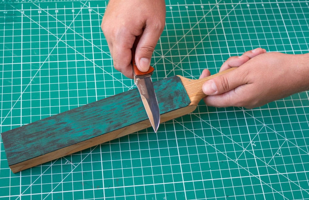 Dwustronna polerka ze skóry bydlęcej na trzpieniu drewnianym w komplecie z pastą polerską zieloną o granulacji 7-5 mikrometrów 25g BeaverCraft LS6P1.