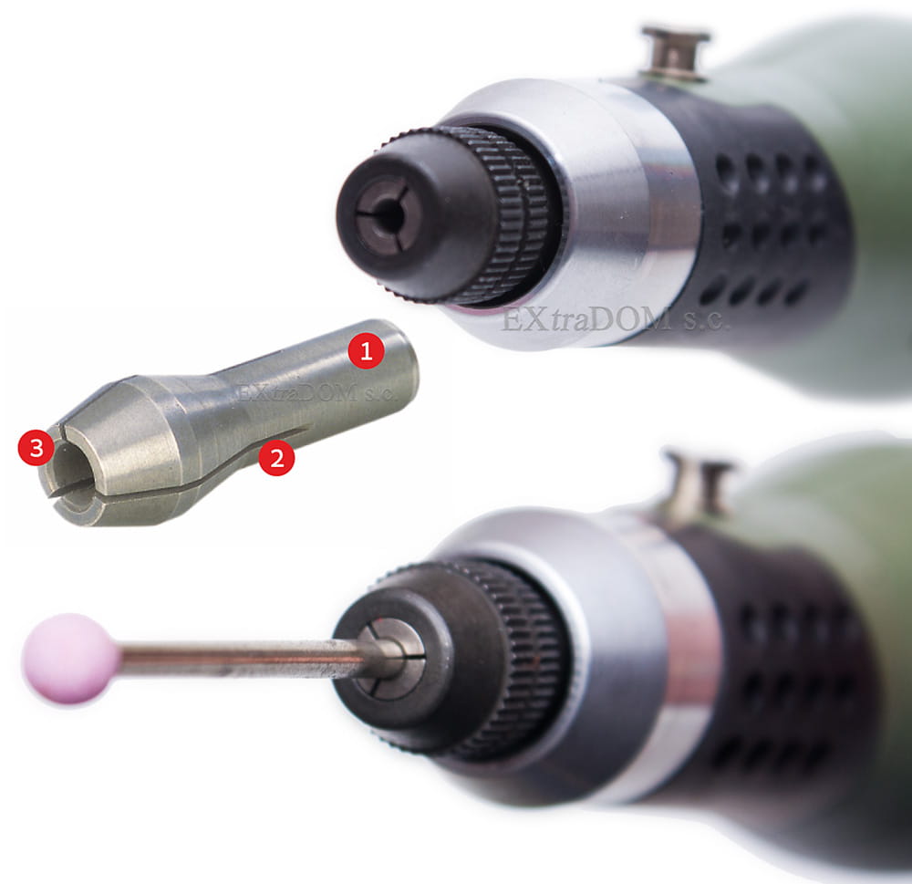 Zaciski narzędziowe będące na wyposażeniu Micromot 230/E są hartowane dzięki czemu posiadają odpowiednią elastyczność (patrz 1). Charakteryzują się wydłużoną żywotnością nawet przy intensywnym użytkowaniu - są baz porównania bardziej precyzyjne oraz trwałe od uchwytów czteroszczękowych (naciętych na krzyż) wykonanych z mosiądzu czy aluminium. Potrójne nacięcie (patrz 2) jest dużo trudniejsze i droższe w wykonaniu, jednak zapewnia większą powierzchnię nośną (patrz 3), to szczególnie ważne przy pracy z trzpieniami o małej średnicy oraz przy wykorzystaniu pełnego momentu obrotowego.