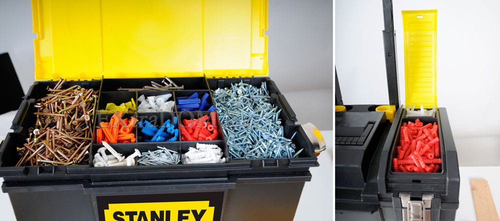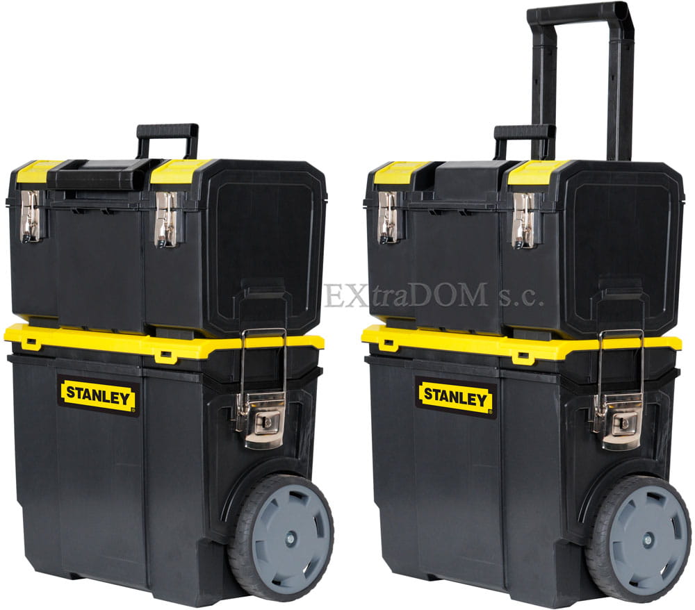 Mobilny warsztat narzędziowy firmy Stanley 70-326. Konstrukcja modułowa złożona z 3 segmentów: odpinanej, dużej skrzyni z organizerami w pokrywie, środkowy organizer na drobiazgi, dolny pojemnik na duże i ciężkie narzędzia.