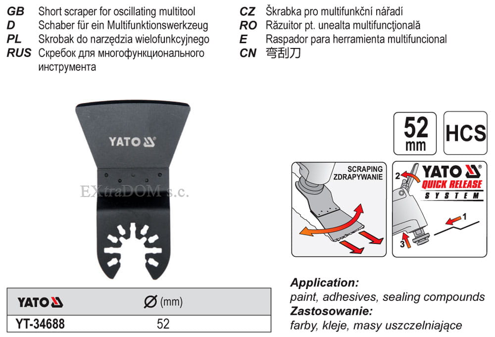 Skrobak do urządzenia wielofunkcyjnego Yato wykonany ze stali HCS. Skrobak należy do całej gamy wszechstronnych akcesoriów Yato do urządzeń wielofunkcyjnych. Przeznaczony do zdzierania klejów, zapraw, powłok lakierniczych i innych podobnych zastosowań.