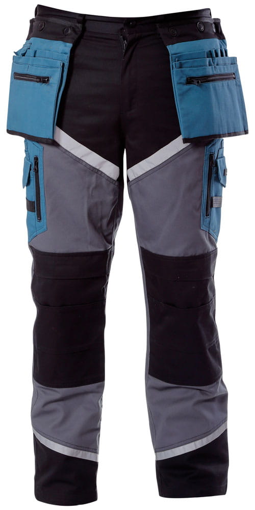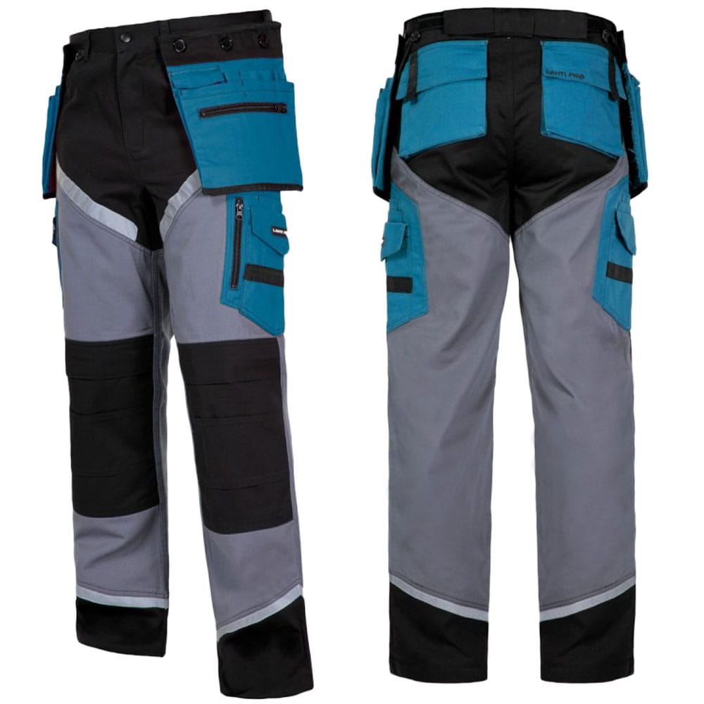 Spodnie robocze, monterskie z elementami odblaskowymi marki Lahti Pro, czarno - szaro - turkusowe. Wysokiej jakości, wyjątkowo wszechstronne i praktyczne spodnie robocze.