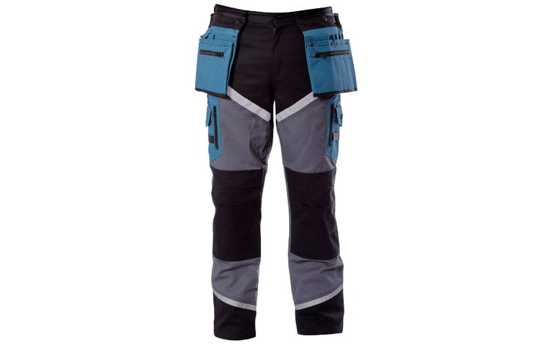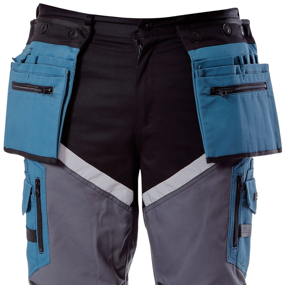 Spodnie robocze, monterskie z elementami odblaskowymi marki Lahti Pro, czarno - szaro - turkusowe. Wysokiej jakości, wyjątkowo wszechstronne i praktyczne spodnie robocze.