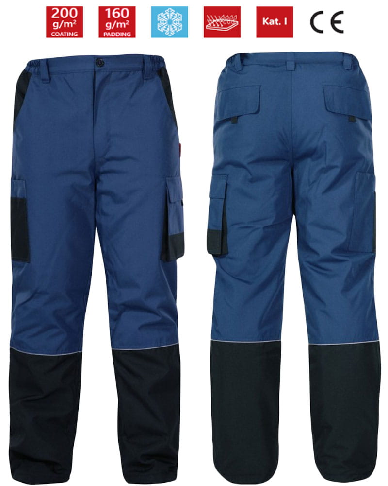 Spodnie robocze ocieplane do pasa marki Lahti Pro, niebieskie z czarnymi dodatkami oraz z elementami odblaskowymi. Wysokiej jakości odzież robocza na chłodne zimowe dni.