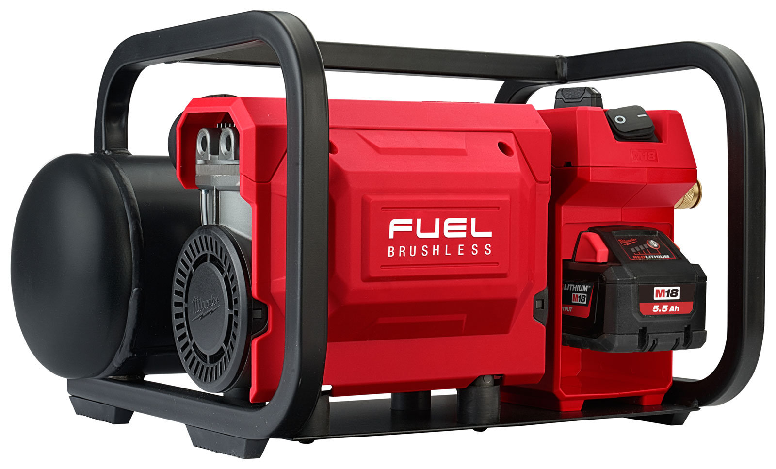 Sprężarka akumulatorowa Milwaukee M18FAC, wyposażona w bezszczotkowy silnik POWERSTATE™ zapewnia maksymalne ciśnienie powietrza 9,31 bara i przepływ 48 l/min. przy 2,8 bara, co gwarantuje wydajność wystarczającą do pracy zwykłych gwoździarek i zszywaczy