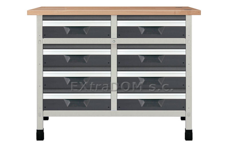 Stół warsztatowy 113cm 8069000. Profesjonalny stół warsztatowy firmy Wolfcraft. Powierzchnia robocza o wymiarach 113 x 65 cm. Pod blatem, po lewej i prawej stronie po cztery szuflady wysokości 14 cm każda.