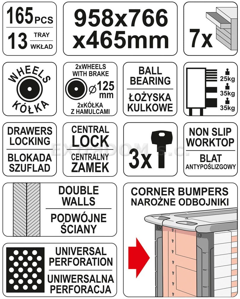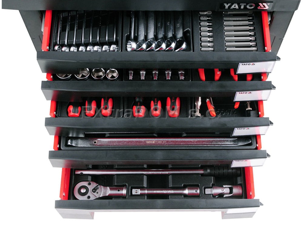 Profesjonalna szafka warsztatowa marki Yato z 7 szufladami. 5 górnych szuflad zawiera 165 starannie dobranych narzędzi. Niezbędna w warsztatach samochodowych i stacjach obsługi pojazdów. Szafka pochodzi z najnowszej linii mebli warsztatowych Yato wyróżniających się: