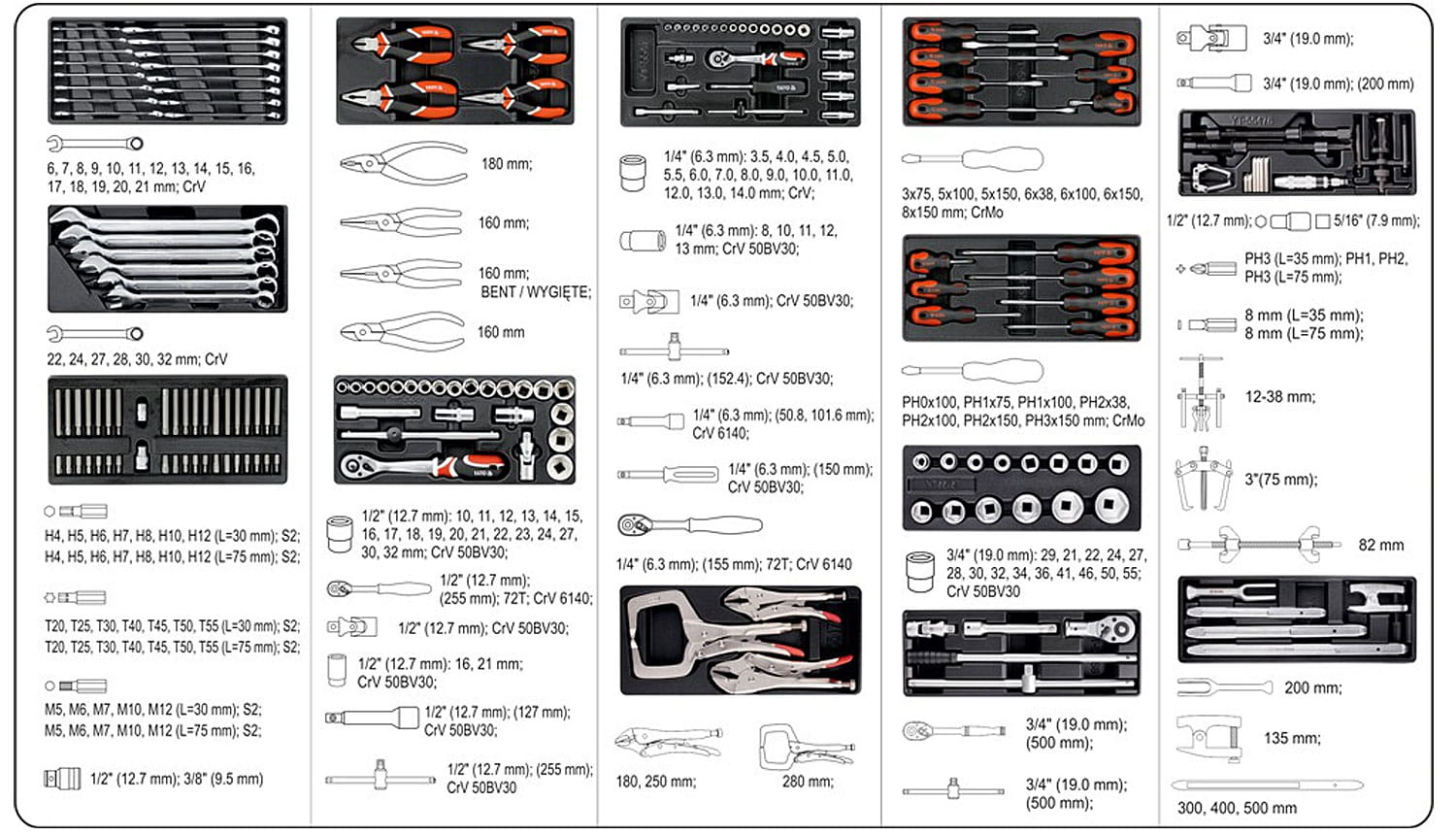 - WKŁAD 8: wkrętaki krzyżakowe YT-2771 PH0x100 MM; YT-2772 PH1x75 MM, YT-2773 PH1x100 MM, YT-2775 PH2x38 MM, YT-2776 PH2x100 MM, YT-2777 PH2x150 MM, YT-2779 PH3X150 MM