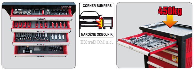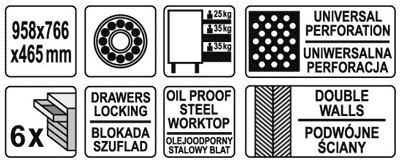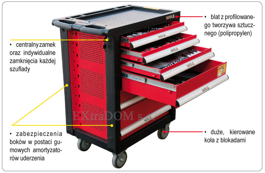 - Łatwy w obsłudze system zamknięć i zabezpieczeń, centralny zamek i indywidualne zamknięcie każdej szuflady zapewniają bezpieczeństwo przechowywanych narzędzi.