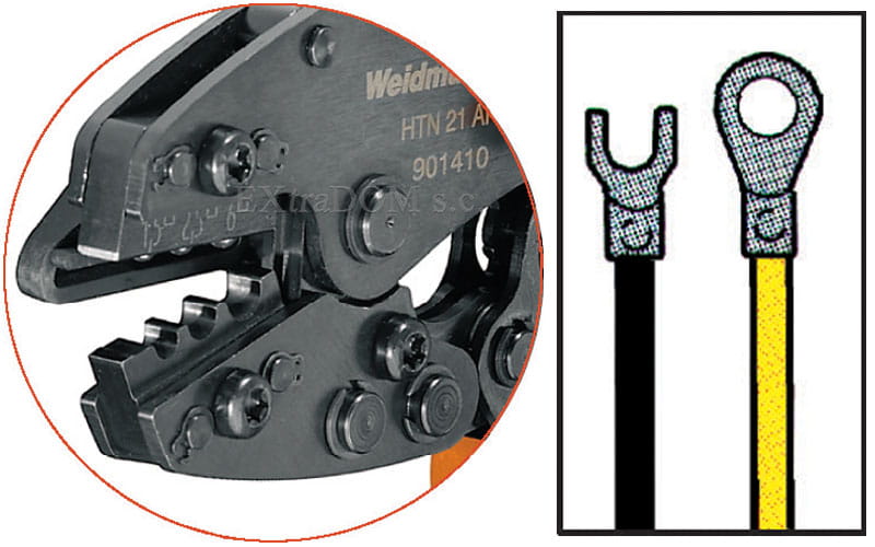- Zaciskanie końcówek i złączy bez izolacji w przekrojach od 0,5 - 6 mm² np. końcówki toczone, końcówki oczkowe, końcówki wtykowe, złącza szeregowe i równoległe, złącza wtykowe - patrz grafika poniżej.