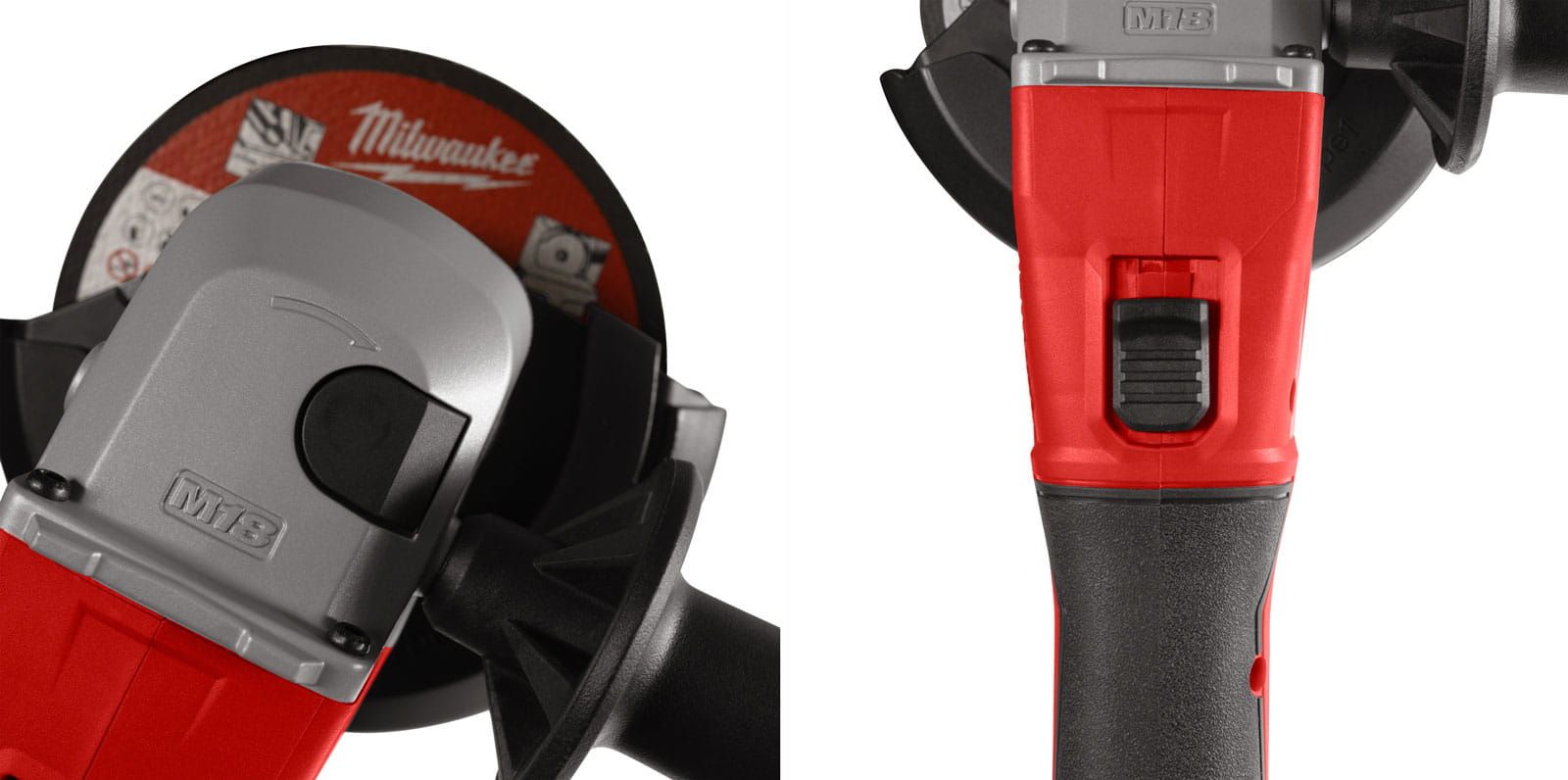 - Elektroniczna ochrona przed odrzutem = pracujesz bezpieczniej w sytuacjach, gdy tarcza nagle natrafi na duży opór i pojawia się ryzyko szarpnięcia narzędzia.