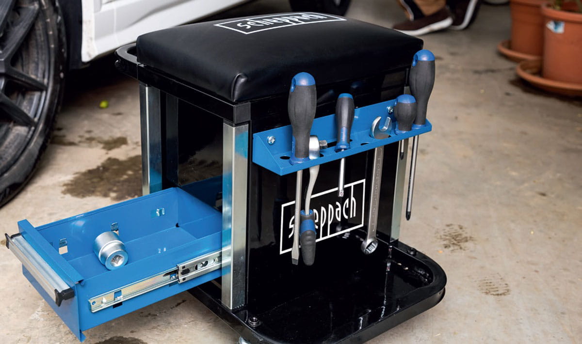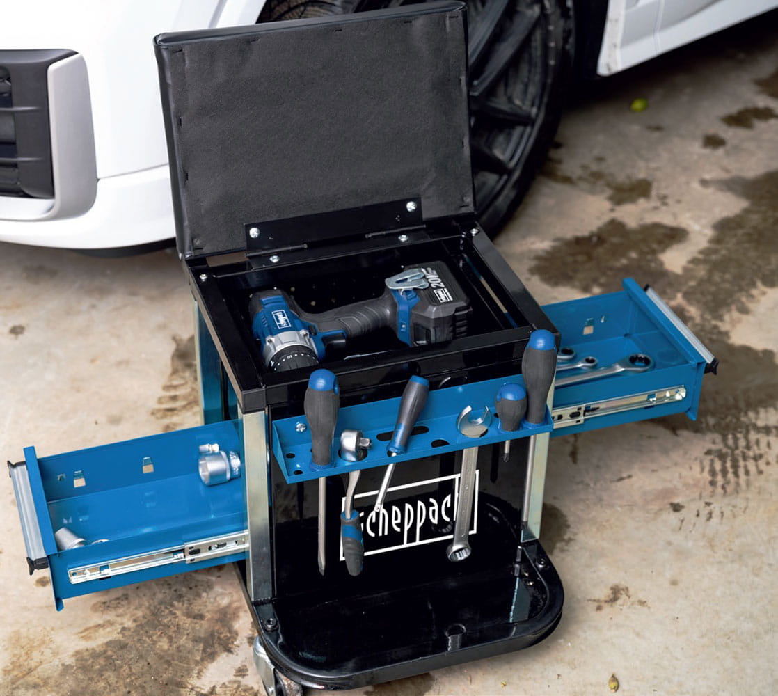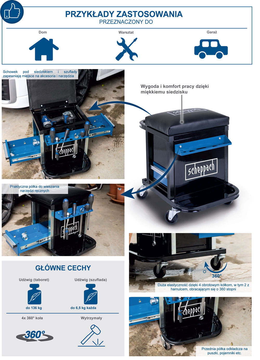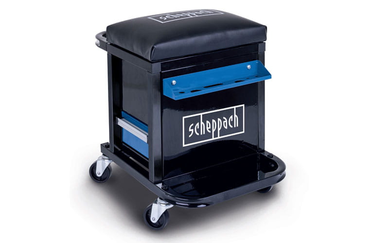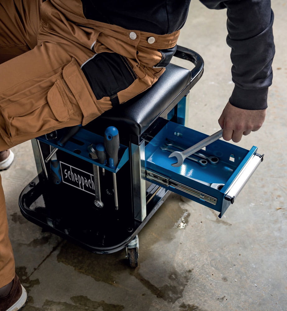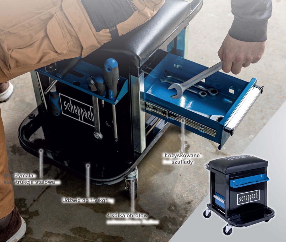 Taboret warsztatowy 2w1 wyposażony w miękkie siedzisko, stołek z funkcją szafki narzędziowej z 2 szufladami, górnym schowkiem i półką TW900 firmy SCHEPPACH.