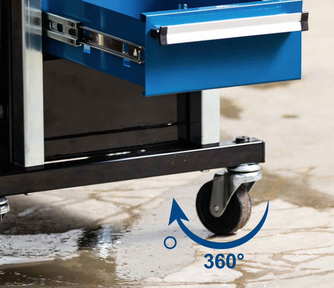 - 4 kółka obracające się o 360 stopni - 2 z nich wyposażone w hamulce umożliwiają swobodne poruszanie się po warsztacie. - Szafka z dwiema szufladami i górnym schowkiem: