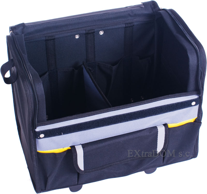 Wyposażona w liczne przegrody i kieszenie, umożliwia szybki dostęp do wszystkich niezbędnych przyrządów, co zwiększa wydajność i komfort pracy. Dzięki kołom na wysokiej jakości łożyskach, transport jest niezwykle wygodny nawet przy dużym ciężarze zawartości.