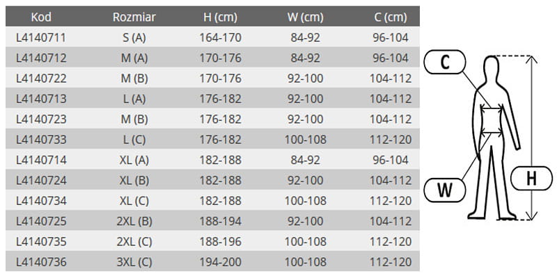 - obwód klatki piersiowej (C): 96 - 104 cm.
