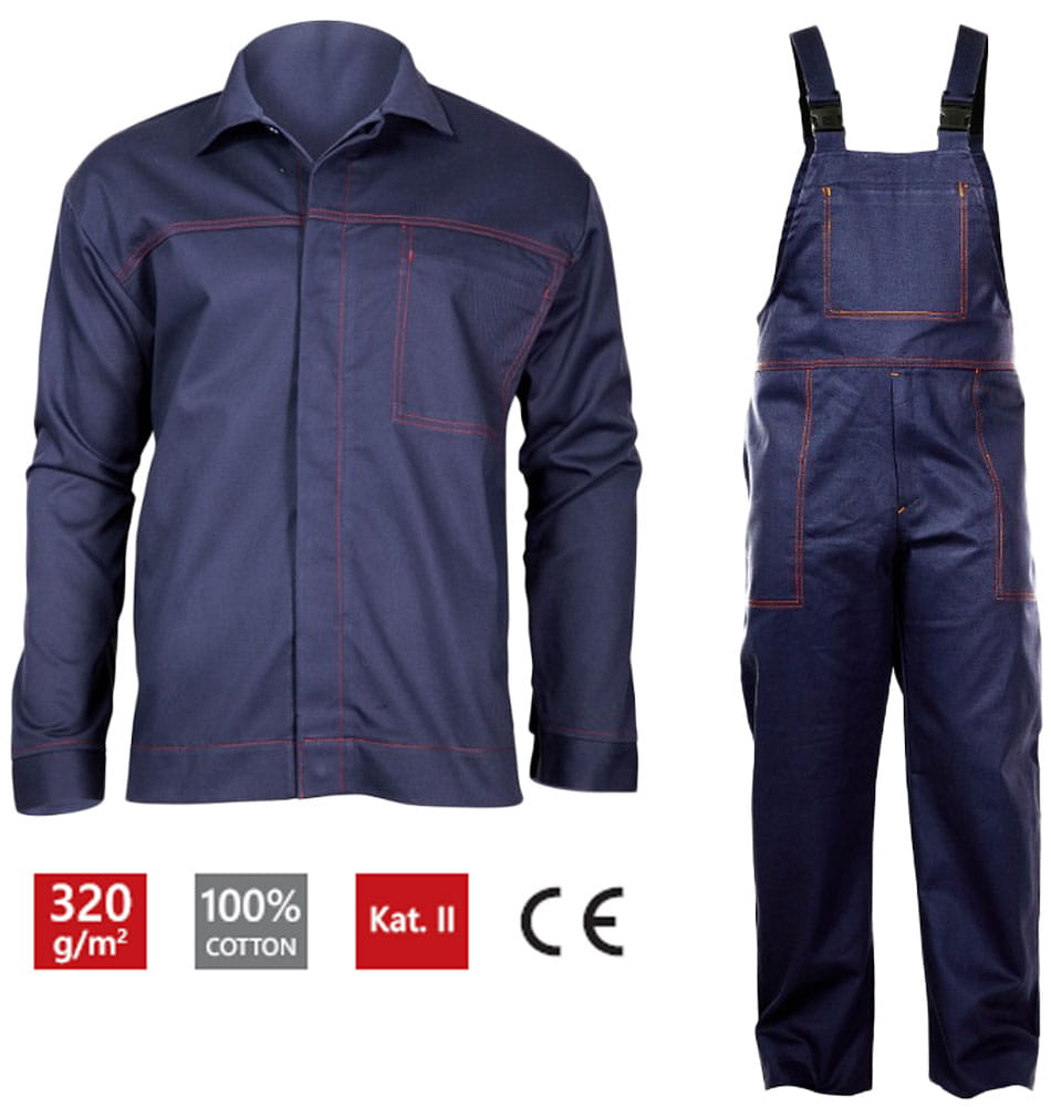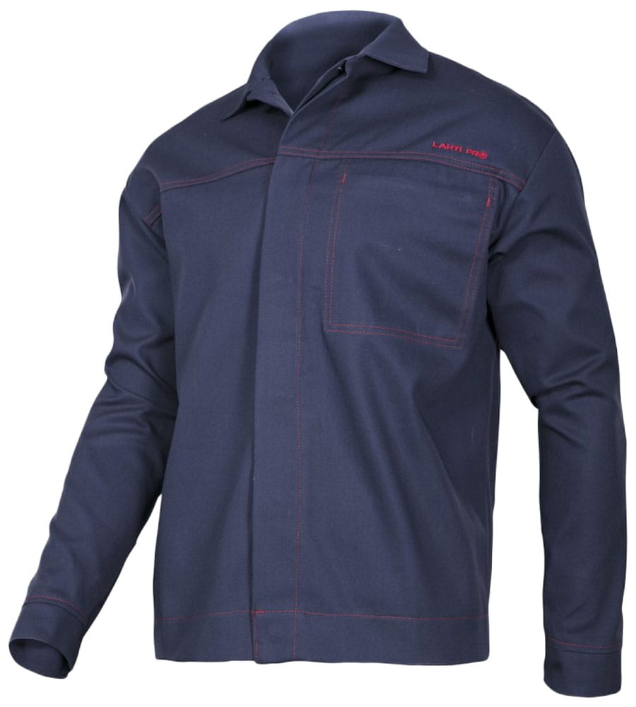 Ubranie spawalnicze, komplet bluza i spodnie Lahti Pro w kolorze granatowym. Trudnozapalna ochronna odzież robocza stosowania podczas spawania oraz w procesach pokrewnych, odporna na działanie czynników gorących i płomienia.