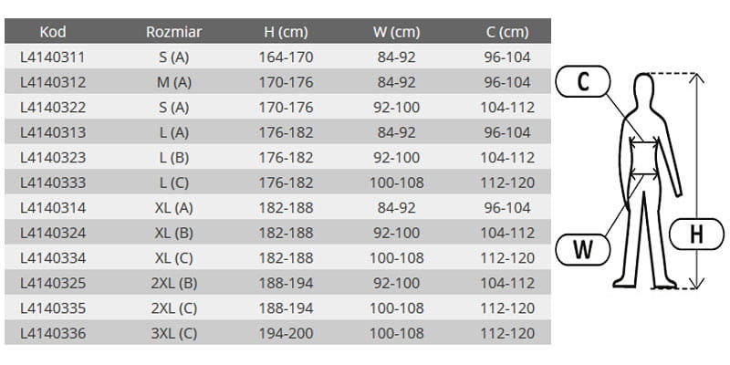 - obwód klatki piersiowej (C): 112 - 120 cm.