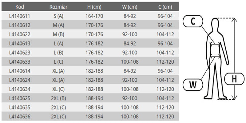 - obwód klatki piersiowej (C): 104 - 112 cm.