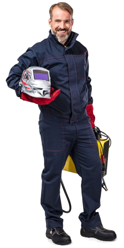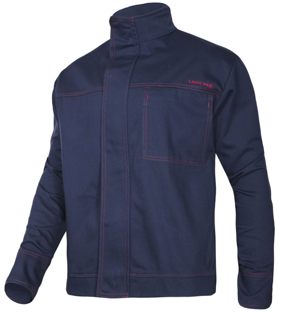 Ubranie spawalnicze, komplet bluza i spodnie Lahti Pro ze wzmocnionymi mankietami w kolorze granatowym. Trudnozapalna ochronna odzież robocza stosowania podczas spawania oraz w procesach pokrewnych, odporna na działanie czynników gorących i płomienia.