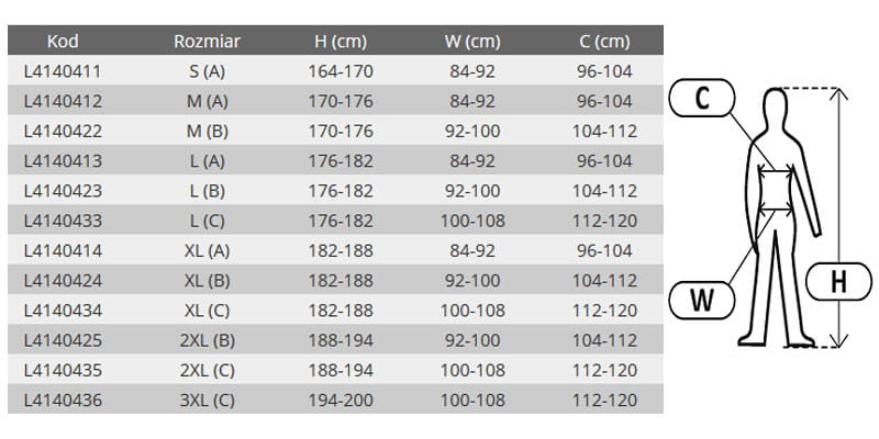 - obwód klatki piersiowej (C): 104 - 112 cm.