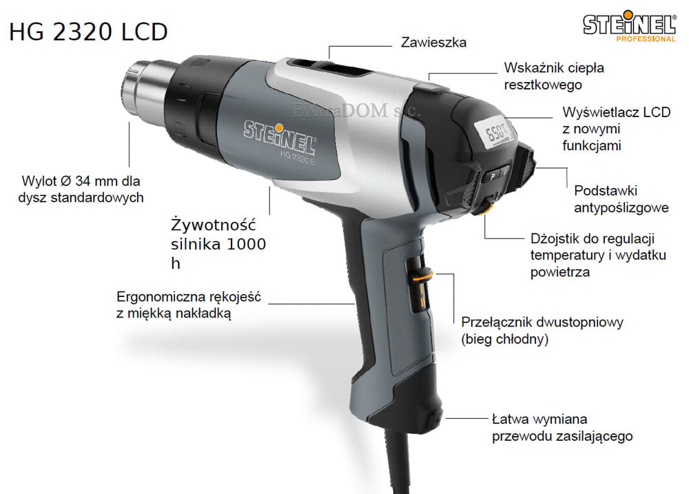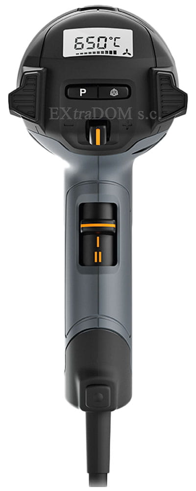 - Wyświetlacz LCD temperatury (wskazuje temperaturę u wylotu grzałki oraz wydatek powietrza).