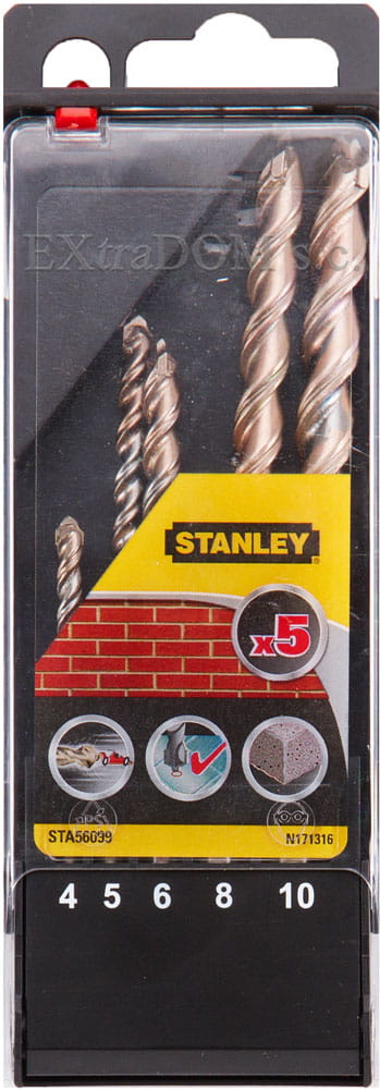Wiertła precyzyjne do muru, cegły, pustaka Stanley zestaw 5 sztuk z uchwytem walcowym. Podręczny zestaw wierteł w najpopularniejszych średnicach w plastikowym pudełku.