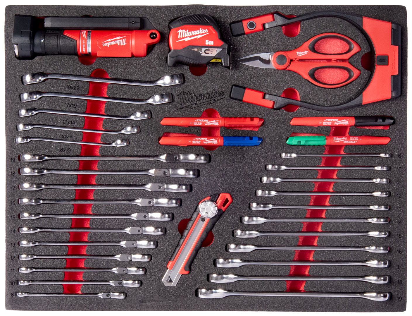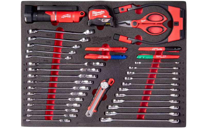 Najważniejsze zalety Wkładka piankowa Milwaukee z zestawem kluczy, oświetlenia, narzędzi do cięcia i pomiaru 36 cz. 4932500759