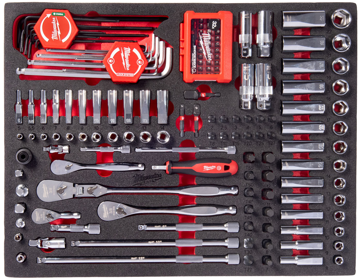 Wkładka piankowa z narzędziami Milwaukee zestaw kluczy, nasadek i bitów 1/4" i 3/8” 153 cz. 4932500756